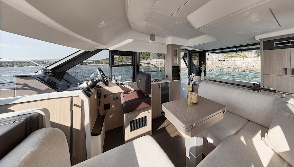 Non è però difficile immaginare che sarà il fly lo spazio più vissuto all’aperto. Anche qui è proposto un layout tradizionale con la combinazione di solarium che diventa la parziale seduta della dinette e una ben accessoriata e completa plancia di comando aperta.
